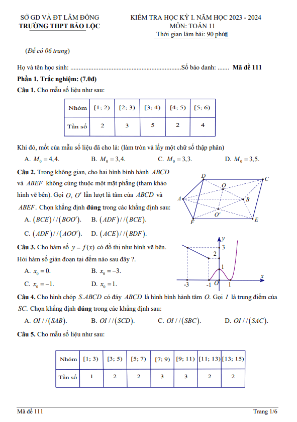 Đề học kỳ 1 Toán lớp 11 năm 2023 – 2024 trường THPT Bảo Lộc