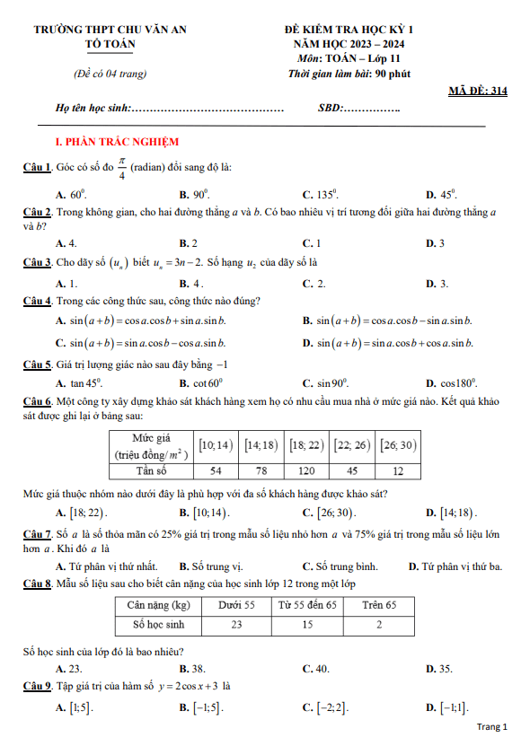 Sytu xin trình bày đến các quý thầy cô và các em học sinh lớp 11 đề kiểm tra cuối học kỳ 1 môn Toán lớp 11 năm học 2023 – 2024 tại trường THPT Chu Văn An, An Giang. Đề thi bao gồm các câu hỏi với đáp án và thang điểm để học sinh có thể tự kiểm tra và ôn tập kiến thức đã học.1. Phần đầu tiên của đề thi đưa ra một bài toán về cân nặng của lợn con thuộc hai giống A và B, được biểu diễn trên biểu đồ với đơn vị là kg. Học sinh cần tính số trung bình và trung vị của hai mẫu số liệu này, sau đó phải so sánh kết quả để chọn ra kết quả khác với các kết quả còn lại.2. Phần thứ hai của đề thi đưa ra bài toán về tam giác ABC đều cạnh bằng a. Học sinh cần tìm diện tích của các tam giác ABC 111, ABC 222 và ABC nnn dựa trên các định lý về tam giác đồng dạng và trung điểm của đoạn thẳng.3. Cuối cùng, đề thi đưa ra một bài toán về hình lục giác đều có độ dài cạnh bằng 1, sau đó hỏi về quãng đường mà điểm Y của lục giác đã di chuyển khi lục giác được lăn cuốn tròn về phía trước theo một đường thẳng. Học sinh cần tính toán và chọn ra đáp án chính xác nhất.Đề thi này giúp học sinh rèn luyện kỹ năng giải bài toán, áp dụng kiến thức hiểu biết đã học vào thực tế và phát triển tư duy logic, sáng tạo. Hy vọng rằng đề thi sẽ mang lại cơ hội cho học sinh tự kiểm tra và nâng cao kiến thức của mình để chuẩn bị tốt cho kỳ thi cuối kỳ sắp tới.