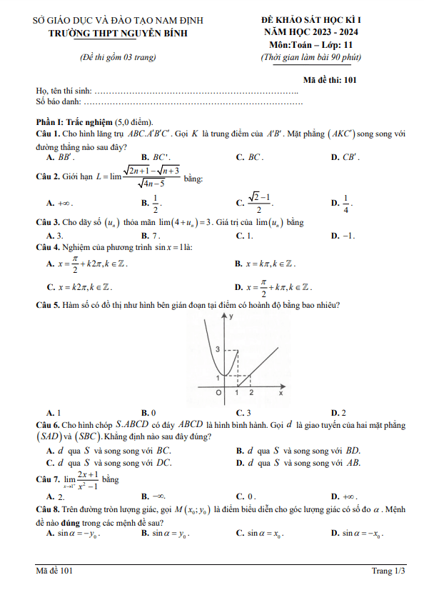 Ban quản lý trường THPT Nguyễn Bính xin gửi đến quý thầy cô giáo và các em học sinh lớp 11 đề khảo sát cuối học kì 1 môn Toán năm học 2023 – 2024. Đề thi được thiết kế hình thức 50% trắc nghiệm và 50% tự luận, với thời gian làm bài là 90 phút. Đề bao gồm đáp án và hướng dẫn chấm điểm để giúp các em tự kiểm tra và đánh giá kết quả của mình.