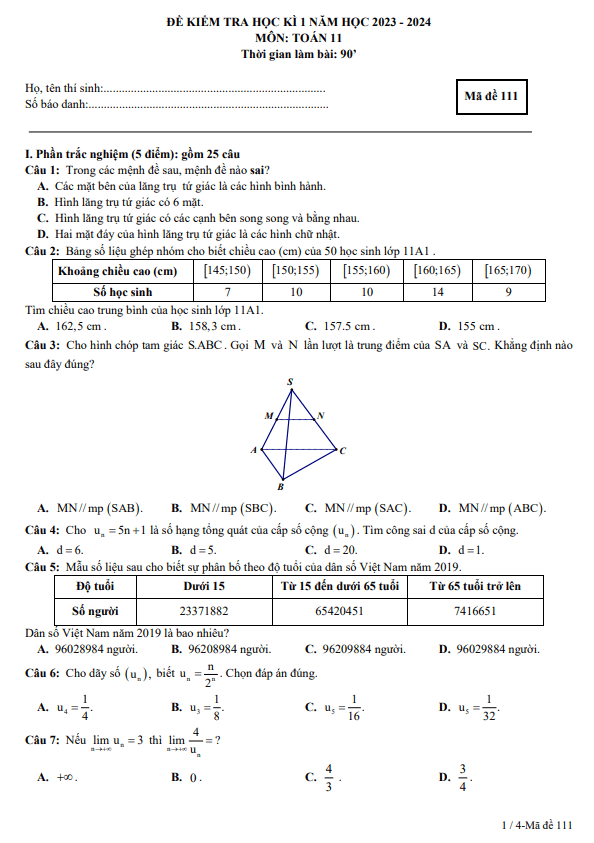 Chào đón quý thầy cô và các em học sinh lớp 11! Chúng ta sẽ cùng tìm hiểu về đề kiểm tra cuối học kì 1 môn Toán cho lớp 11 năm học 2023 – 2024 tại trường THPT Thạch Bàn, Hà Nội. Đề thi bao gồm các câu hỏi trắc nghiệm với mã đề 111 và mã đề 112.