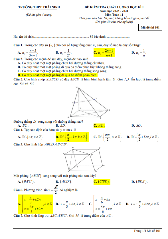 Sytu xin chào quý thầy cô và các em học sinh lớp 11! Hôm nay, chúng ta sẽ cùng nhau đi vào nội dung của đề kiểm tra cuối học kì 1 môn Toán lớp 11 năm học 2023 – 2024 tại trường THPT Thái Ninh, tỉnh Thái Bình. Đề thi sẽ có đáp án với mã đề 101.