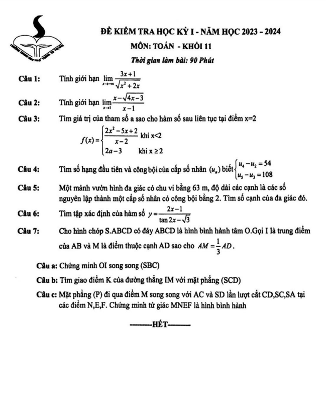 Sytu xin gửi đến quý thầy, cô giáo và các em học sinh lớp 11 đề kiểm tra cuối học kỳ 1 môn Toán lớp 11 năm học 2023 – 2024 trường THPT Võ Thị Sáu, quận Bình Thạnh, thành phố Hồ Chí Minh. Kỳ thi sẽ diễn ra vào thứ Năm ngày 14 tháng 12 năm 2023.