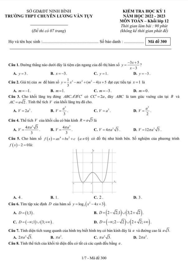 Dưới đây là một số câu hỏi và bài toán từ Đề học kỳ 1 Toán lớp 12 năm 2022 – 2023 trường chuyên Lương Văn Tụy – Ninh Bình: