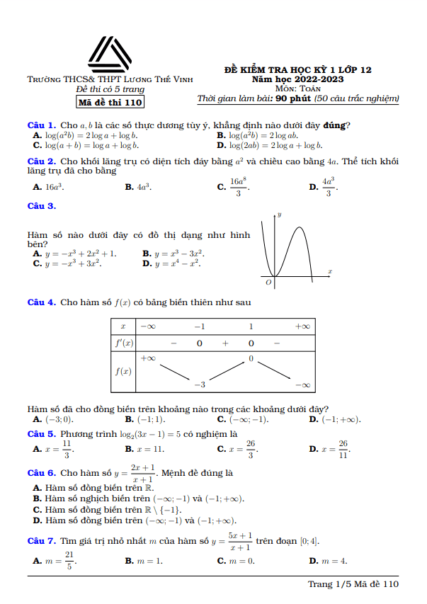 Đề học kỳ 1 Toán lớp 12 năm 2022 – 2023 trường Lương Thế Vinh – Hà Nội