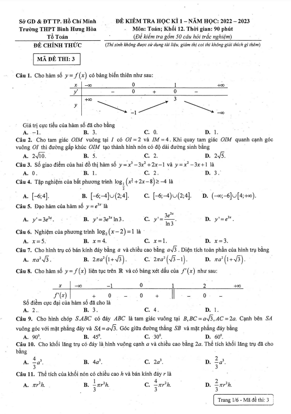 Xin chào quý thầy cô và các em học sinh lớp 12! Hôm nay chúng ta sẽ cùng tìm hiểu về đề kiểm tra chất lượng cuối học kì 1 môn Toán lớp 12 năm học 2022 – 2023 trường THPT Bình Hưng Hòa, thành phố Hồ Chí Minh. Đề thi mã đề 03 này gồm 06 trang với 50 câu hỏi và bài toán dạng trắc nghiệm, thời gian làm bài 90 phút.