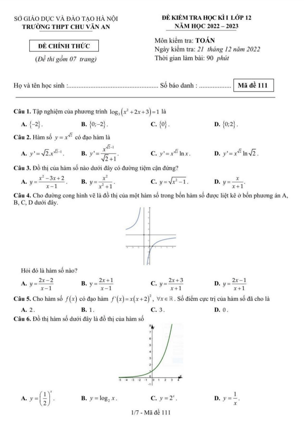 Chúng ta hãy cùng khám phá đề kiểm tra cuối học kì 1 môn Toán lớp 12 năm học 2022 – 2023 của trường THPT Chu Văn An. Đề thi được thiết kế với 50 câu hỏi và bài toán, tất cả đều là dạng trắc nghiệm. Thời gian làm bài là 90 phút, và kỳ thi sẽ diễn ra vào ngày 21 tháng 12 năm 2022.