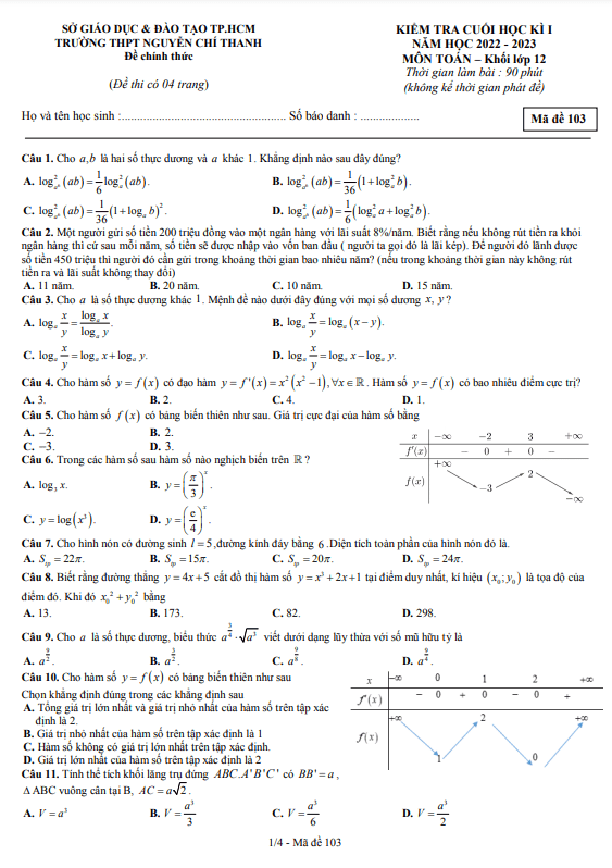 Chào đón đến với đề kiểm tra chất lượng cuối học kì 1 môn Toán lớp 12 năm học 2022 – 2023 tại trường THPT Nguyễn Chí Thanh, thành phố Hồ Chí Minh. Đề thi mã đề 103 gồm 04 trang với 50 câu hỏi và bài toán dạng trắc nghiệm, thời gian làm bài 90 phút (không kể thời gian phát đề).