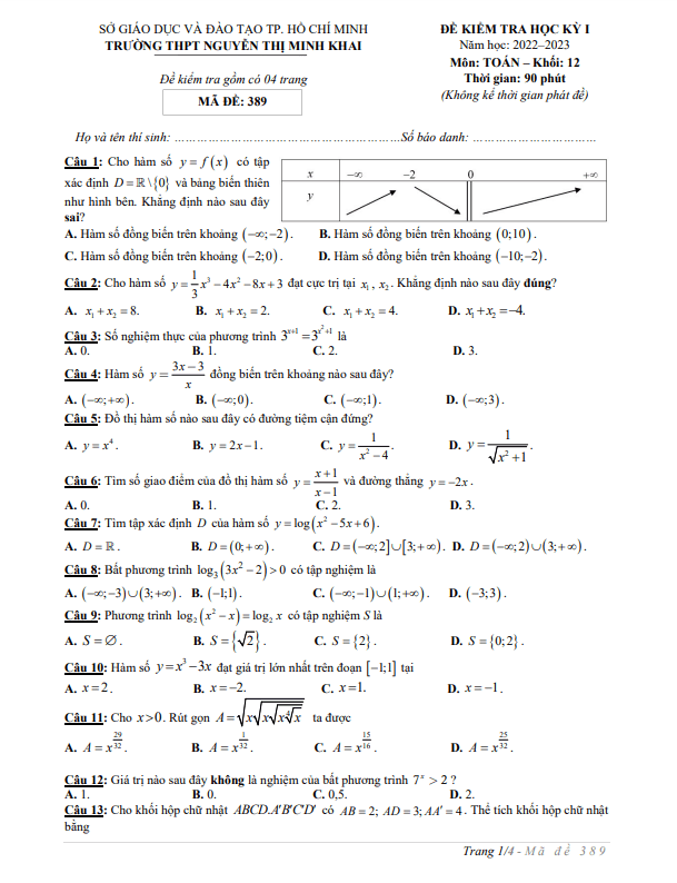 Đây là một số câu hỏi đầu tiên từ đề thi Toán lớp 12 học kỳ 1 năm học 2022 – 2023 của trường THPT Nguyễn Thị Minh Khai, TP HCM. Chúc các em học sinh ôn tập tốt và đạt kết quả cao trong kỳ thi sắp tới!