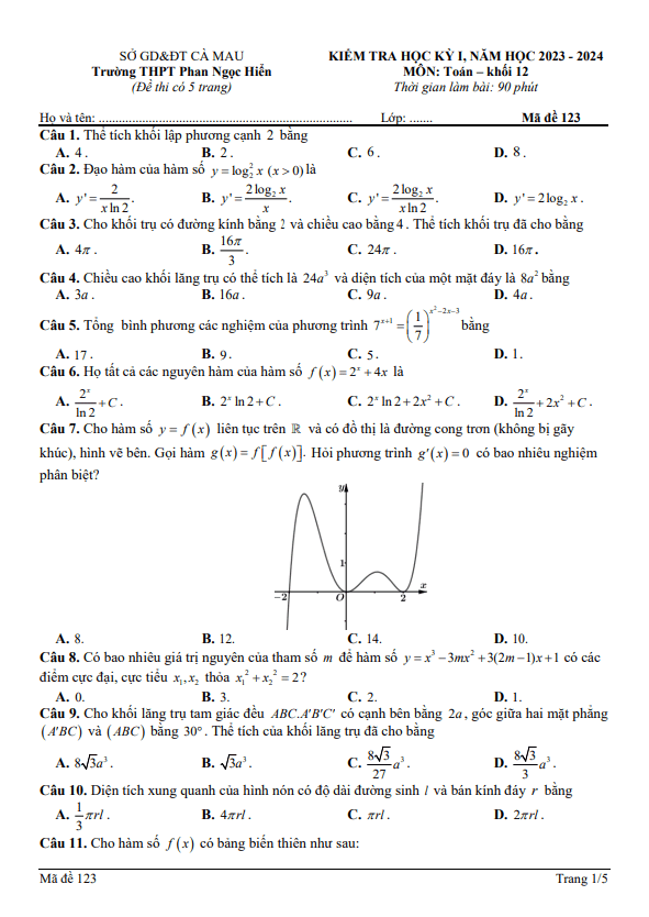 Xin gửi đến quý thầy cô và các em học sinh lớp 12 đề kiểm tra cuối học kỳ 1 môn Toán năm học 2023-2024 tại trường THPT Phan Ngọc Hiển, tỉnh Cà Mau.