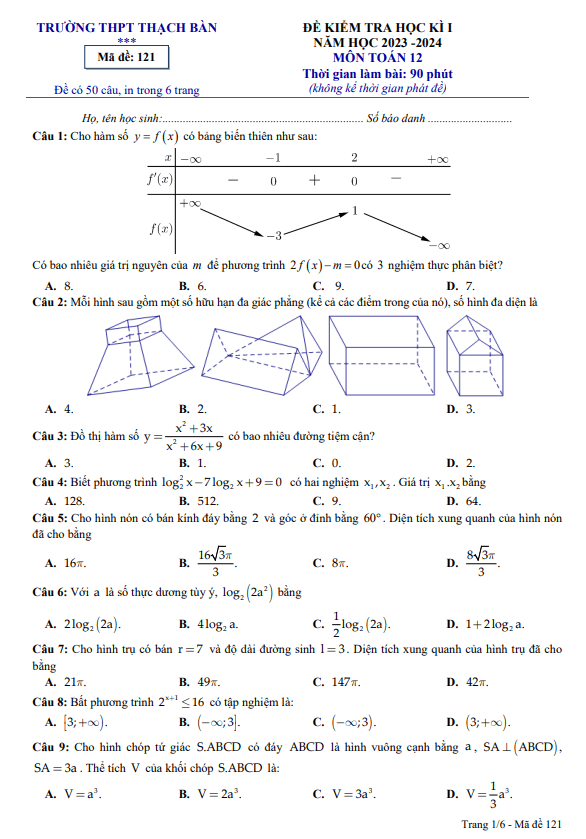 Sytu xin được giới thiệu đến quý thầy, cô giáo và các em học sinh lớp 12 đề kiểm tra cuối học kì 1 môn Toán lớp 12 năm học 2023-2024 trường THPT Thạch Bàn, thành phố Hà Nội. Đề thi bao gồm các mã đề trắc nghiệm là Mã đề 121, Mã đề 122, Mã đề 123, và Mã đề 124.