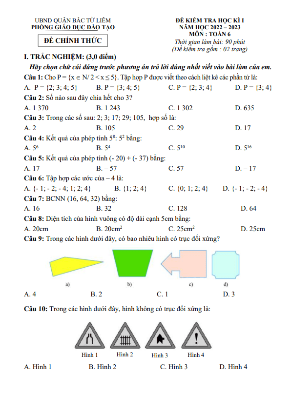 Đề kiểm tra học kì 1 môn Toán lớp 6 năm 2022-2023 phòng GD ĐT Bắc Từ Liêm Hà Nội