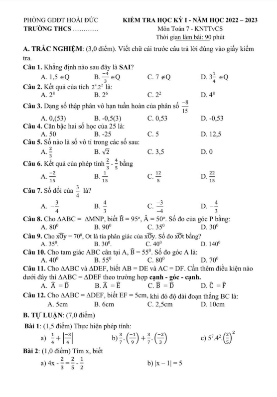 Đề học kì 1 (HK1) lớp 7 môn Toán KNTTvCS năm 2022 2023 phòng GD ĐT Hoài Đức Hà Nội