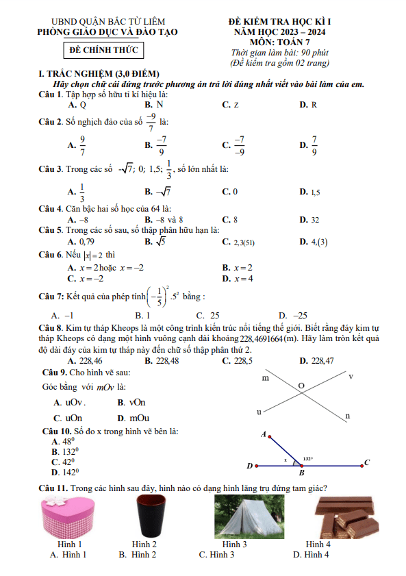 Đề học kì 1 Toán lớp 7 năm 2023 – 2024 phòng GD&ĐT Bắc Từ Liêm – Hà Nội