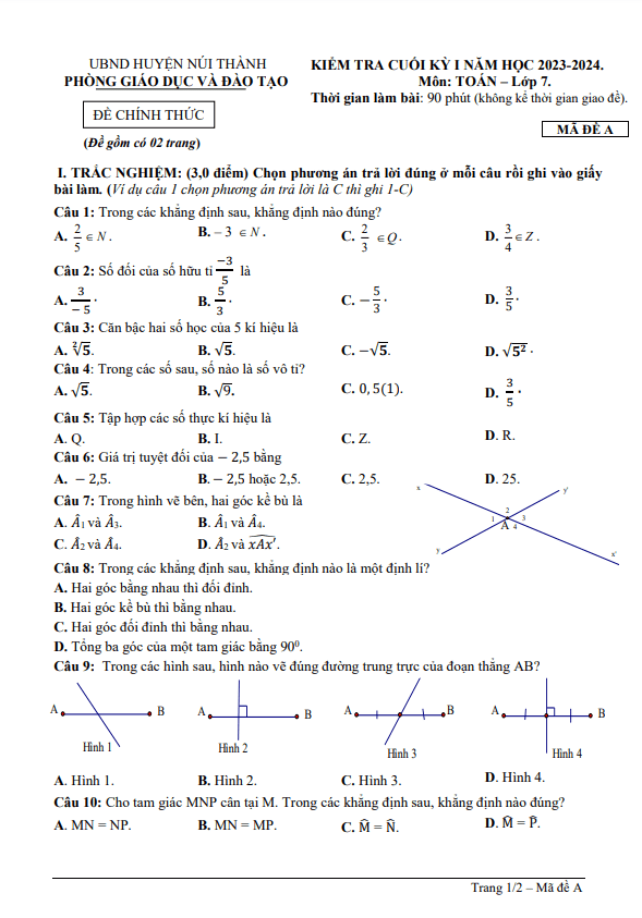 Chào mừng quý thầy cô và các em học sinh lớp 7 đến với đề kiểm tra cuối học kỳ 1 môn Toán lớp 7 năm học 2023-2024 của phòng Giáo dục và Đào tạo UBND huyện Núi Thành, tỉnh Quảng Nam. Trong đề thi này, mình sẽ cung cấp đề thi có đáp án, lời giải chi tiết và hướng dẫn chấm điểm mã đề A – B.