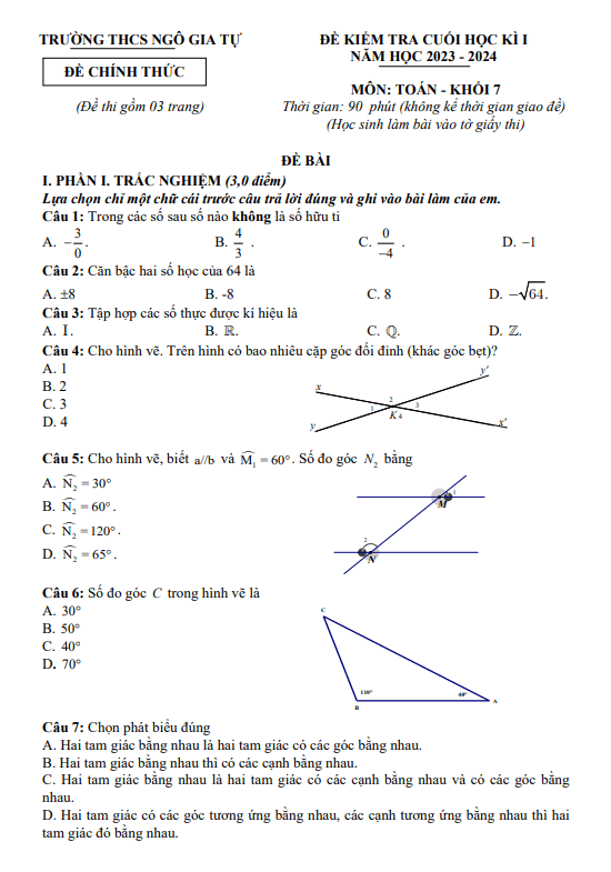Xin chào quý thầy cô và các bạn học sinh lớp 7! Hôm nay chúng ta sẽ cùng nhau điểm qua đề kiểm tra cuối học kì 1 môn Toán lớp 7 năm học 2023 – 2024 tại trường THCS Ngô Gia Tự, thành phố Hải Phòng. Đề thi bao gồm các bài tập sau đây: