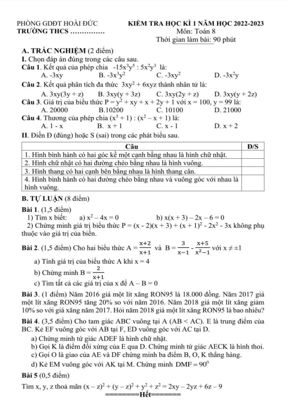 Đề kiểm tra chất lượng cuối học kì 1 môn Toán lớp 8 năm 2022-2023 phòng GDĐT Hoài Đức Hà Nội