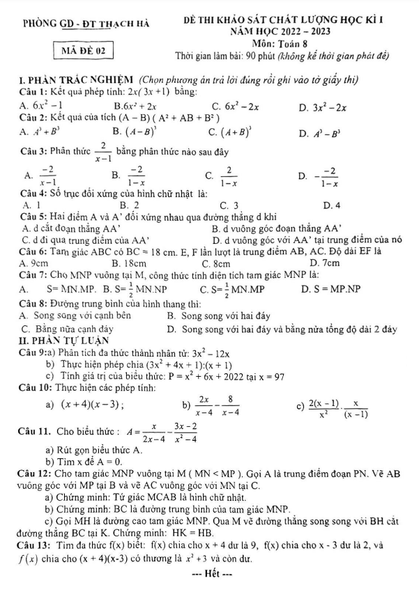 Đề học kì 1 (HK1) lớp 8 môn Toán năm 2022 2023 phòng GD ĐT Thạch Hà Hà Tĩnh