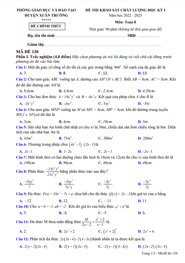 Đề thi học kỳ 1 môn Toán lớp 8 năm 2022 – 2023 của phòng Giáo dục và Đào tạo huyện Xuân Trường, tỉnh Nam Định được biên soạn theo hình thức 40% trắc nghiệm và 60% tự luận. Đề thi này có đáp án, lời giải chi tiết và hướng dẫn chấm điểm theo mã đề 135 – 213 – 359 – 486.Trong đề thi, có bài toán về việc lát gạch cho một sân hình chữ nhật có chiều dài 7m và chiều rộng 5m bằng những viên gạch hình vuông cạnh 4dm. Học sinh cần tính số tiền cần trả để mua đủ số viên gạch lát sân đó. Ngoài ra, đề thi cũng đưa ra các bài toán về hình học, chứng minh và trắc nghiệm với nhiều khái niệm cơ bản như hình bình hành, tứ giác, hình thang và hình vuông. Học sinh cần áp dụng kiến thức đã học để giải quyết các bài toán này.Đề thi hướng đến việc kiểm tra hiểu biết và khả năng áp dụng kiến thức của học sinh đối với nhiều khái niệm toán học cơ bản. Qua đó, giúp học sinh tự tin hơn trong việc ôn tập và chuẩn bị cho kỳ thi học kỳ 1. Với đề thi này, quý thầy cô giáo và các em học sinh lớp 8 đều có cơ hội rèn luyện và nâng cao kiến thức, kỹ năng toán học của mình. Đồng thời, giúp học sinh củng cố kiến thức đã học và chuẩn bị tốt cho các kỳ thi và bài kiểm tra sắp tới.