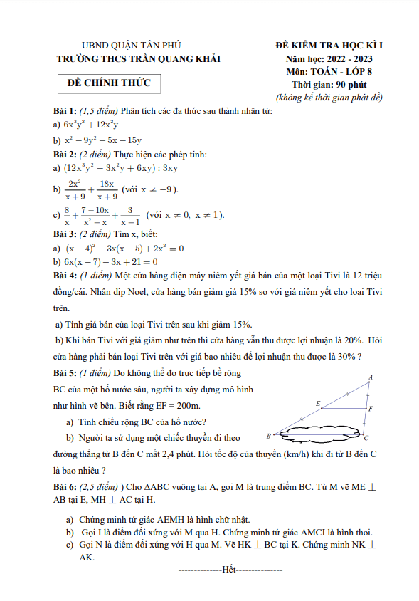 Đề học kì 1 (HK1) lớp 8 môn Toán năm 2022-2023 trường THCS Trần Quang Khải TP HCM