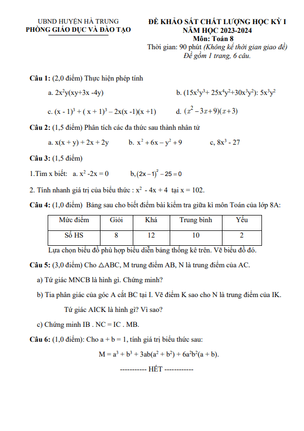 Đề học kì 1 Toán lớp 8 năm 2023 – 2024 phòng GD&ĐT Hà Trung – Thanh HóaChúng tôi xin giới thiệu đến quý thầy cô và các em học sinh lớp 8 bài khảo sát chất lượng cuối học kỳ 1 môn Toán năm học 2023 – 2024 từ phòng Giáo dục và Đào tạo UBND huyện Hà Trung, tỉnh Thanh Hóa. Đề thi này bao gồm đáp án và hướng dẫn chấm điểm.Một số nội dung trong đề bao gồm:- Bảng thống kê điểm bài kiểm tra giữa kỳ môn Toán của lớp 8A, chỉ ra số lượng học sinh đạt các mức điểm Giỏi, Khá, Trung bình, Yếu.- Yêu cầu lựa chọn biểu đồ phù hợp để biểu diễn bảng thống kê trên và vẽ biểu đồ đó.- Bài toán về tam giác △ABC, với điểm M trung điểm của AB, điểm N trung điểm của AC. Phần câu hỏi yêu cầu chứng minh loại hình tứ giác của MNCB, tính chất của tứ giác AICK và điểm K.- Yêu cầu chứng minh một phép toán trong tam giác IB. NC = IC . MB.Đây là một đề thi đa dạng và bám sát chương trình học, giúp học sinh rèn luyện kỹ năng giải bài toán và hiểu biết vững về kiến thức Toán học.File Word chứa đầy đủ nội dung đề thi và phù hợp cho quý thầy cô tham khảo và sử dụng trong quá trình giảng dạy.Chúng tôi hy vọng rằng đề thi này sẽ giúp các em học sinh lớp 8 nắm vững kiến thức và chuẩn bị tốt cho kỳ thi học kỳ 1.
