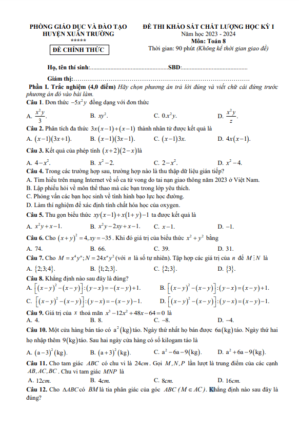 Bộ Đề học kì 1 (HK1) môn Toán lớp 8 năm 2023 – 2024 của phòng Giáo dục và Đào tạo Xuân Trường, Nam Định đã được Sytu giới thiệu đến quý thầy cô và các em học sinh. Đề thi bao gồm 40% câu hỏi trắc nghiệm và 60% câu hỏi tự luận, thời gian làm bài là 90 phút, có đáp án và hướng dẫn chấm điểm.Một số câu hỏi trong đề thi như sau:1. Trong các trường hợp sau, trường hợp nào là thu thập dữ liệu gián tiếp? A. Tìm hiểu trên mạng Internet về số ca tử vong do tai nạn giao thông năm 2023 ở Việt Nam. B. Lập phiếu hỏi về môn thể thao mà các bạn trong lớp yêu thích. C. Phỏng vấn các bạn học sinh về tình hình bạo lực học đường. D. Làm thí nghiệm để xác định tính chất hóa học của oxygen.2. Trong các nhận định sau, nhận định nào đúng? A. Hình chữ nhật có hai đường chéo vuông góc với nhau là hình vuông. B. Hình thang có một góc vuông là hình chữ nhật. C. Hình bình hành có hai đường chéo cắt nhau tại trung điểm của mỗi đường là hình thoi. D. Hình thoi có một đường chéo là đường phân giác của một góc là hình vuông.3. Biểu đồ dưới đây biểu diễn số lượng các bạn học sinh khối 8 yêu thích các loại hình nghệ thuật văn hóa dân gian. Dân ca quan họ Bắc Ninh Múa rối nước Hát chèo (3 học sinh). a) Biểu đồ thuộc loại nào? Mỗi biểu tượng ứng với bao nhiêu học sinh? b) Lập bảng thống kê và vẽ biểu đồ cột biểu diễn dữ liệu này.Đây là một bộ đề thi khá đa dạng về nội dung và dạng bài tập, giúp học sinh lớp 8 rèn luyện kỹ năng và kiến thức Toán một cách hiệu quả.