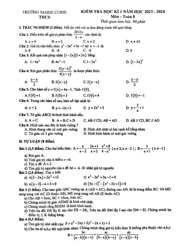 Đề kiểm tra cuối học kì 1 môn Toán lớp 8 năm học 2023 – 2024 trường Marie Curie Hà Nội