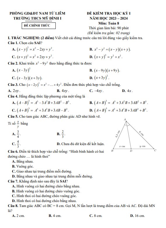 Giới thiệu Đề học kì 1 Toán lớp 8 năm 2023-2024 trường THCS Mỹ Đình 1 Hà Nội
