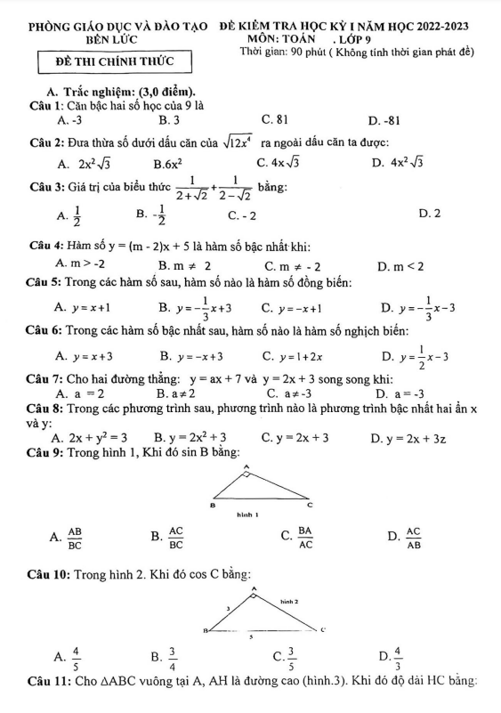 Đề học kỳ 1 Toán lớp 9 năm 2022 – 2023 phòng GD&ĐT Bến Lức – Long An