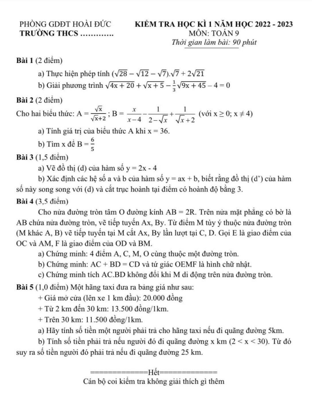 Đề học kì 1 Toán lớp 9 năm 2022 – 2023 phòng GD&ĐT Hoài Đức Hà Nội