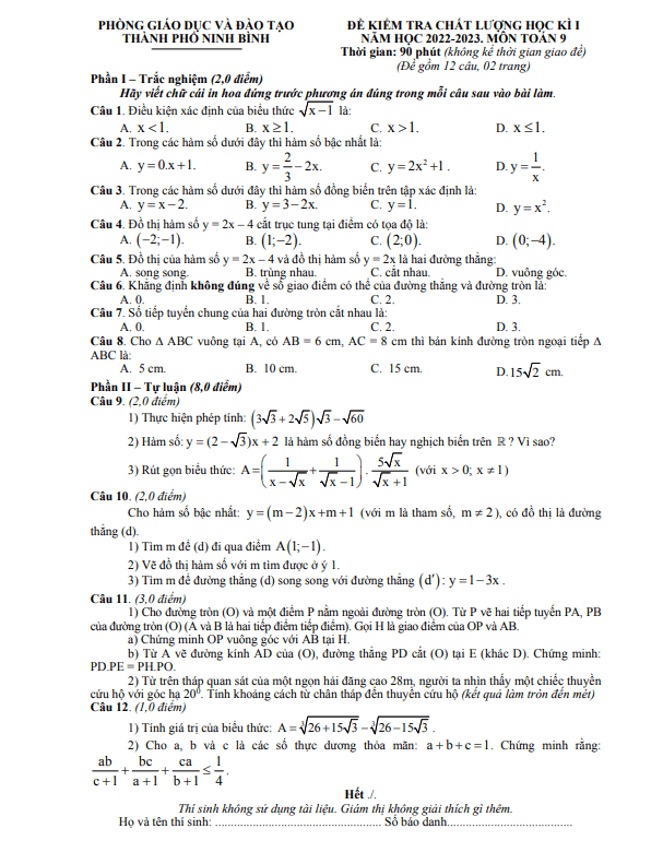 Đề học kì 1 (HK1) lớp 9 môn Toán năm 2022 2023 phòng GD ĐT thành phố Ninh Bình