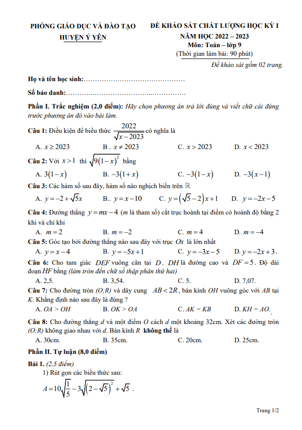 Sytu xin gửi đến quý thầy cô và các em học sinh lớp 9 đề thi khảo sát chất lượng cuối học kỳ 1 môn Toán năm học 2022-2023 của phòng Giáo dục và Đào tạo huyện Ý Yên, tỉnh Nam Định. Đề thi được biên soạn theo tỉ lệ 20% trắc nghiệm và 80% tự luận, thời gian làm bài 90 phút. Đề thi bao gồm đáp án, lời giải chi tiết và hướng dẫn chấm điểm.