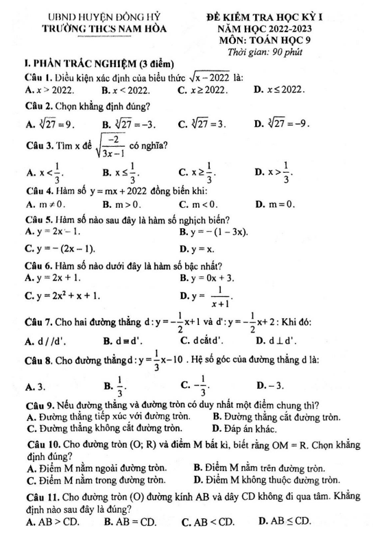 Đề học kì 1 Toán lớp 9 năm 2022 – 2023 trường THCS Nam Hòa – Thái Nguyên