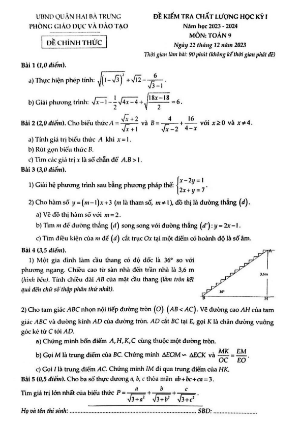 Đề học kì 1 Toán lớp 9 năm 2023-2024 phòng GD ĐT Hai Bà Trưng Hà Nội