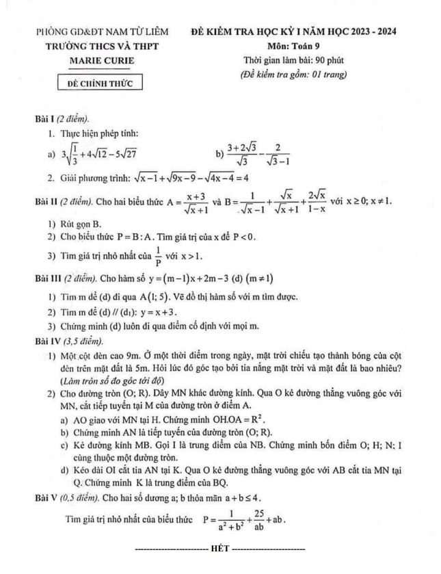 Xin chào quý thầy cô và các em học sinh lớp 9. Dưới đây là đề kiểm tra cuối học kỳ 1 môn Toán lớp 9 năm học 2023 – 2024 tại trường THCS và THPT Marie Curie, quận Nam Từ Liêm, thành phố Hà Nội. Hãy cùng Sytu tìm hiểu nội dung chi tiết của đề thi nhé!