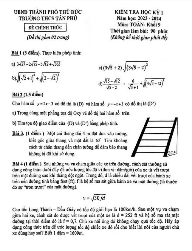 Đề học kì 1 Toán lớp 9 năm 2023 – 2024 Trường THCS Tân Phú TP HCM