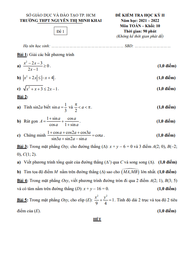 Chúng tôi xin giới thiệu đến quý thầy cô và các em học sinh lớp 10 đề kiểm tra chất lượng cuối học kỳ 2 môn Toán năm học 2021 – 2022 tại trường THPT Nguyễn Thị Minh Khai, TP HCM. Đề thi được biên soạn theo hình thức tự luận, thời gian làm bài 90 phút (không tính thời gian phát đề), kèm theo đáp án, lời giải chi tiết và hướng dẫn chấm điểm.