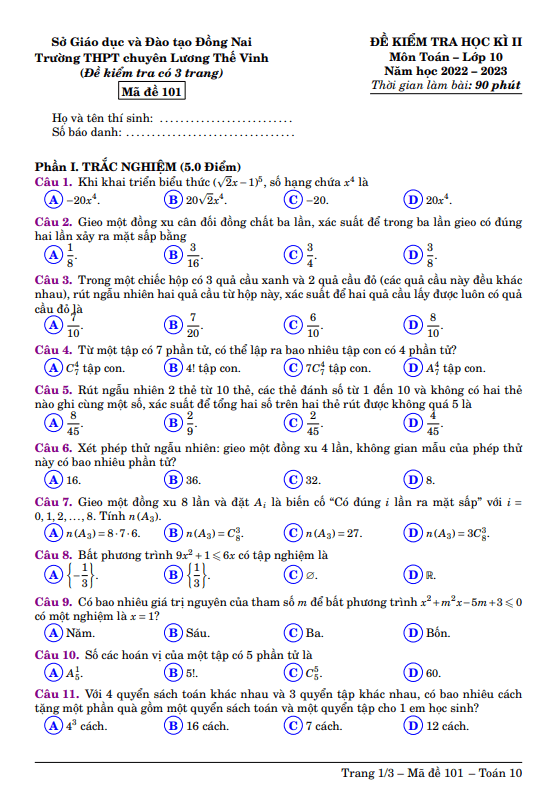 Đề học kì 2 (HK2) lớp 10 môn Toán năm 2022-2023 trường chuyên Lương Thế Vinh Đồng Nai