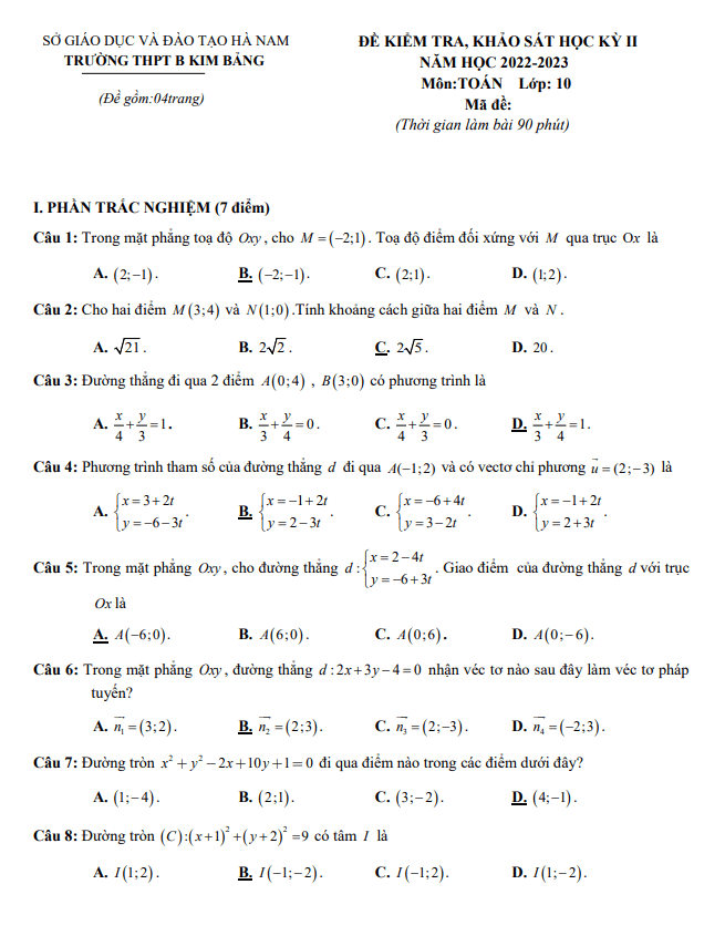 Đề học kì 2 Toán lớp 10 năm 2022-2023 trường THPT B Kim Bảng Hà Nam