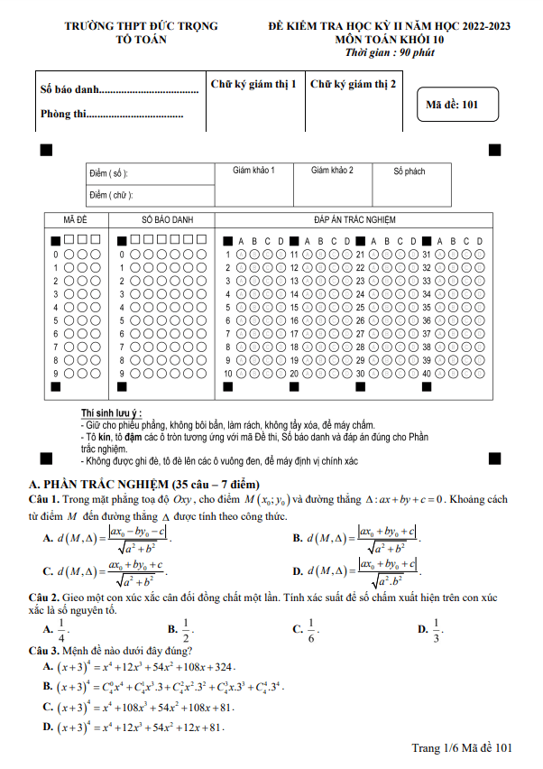Đề học kỳ 2 Toán lớp 10 năm học 2022 – 2023 trường THPT Đức Trọng, Lâm Đồng