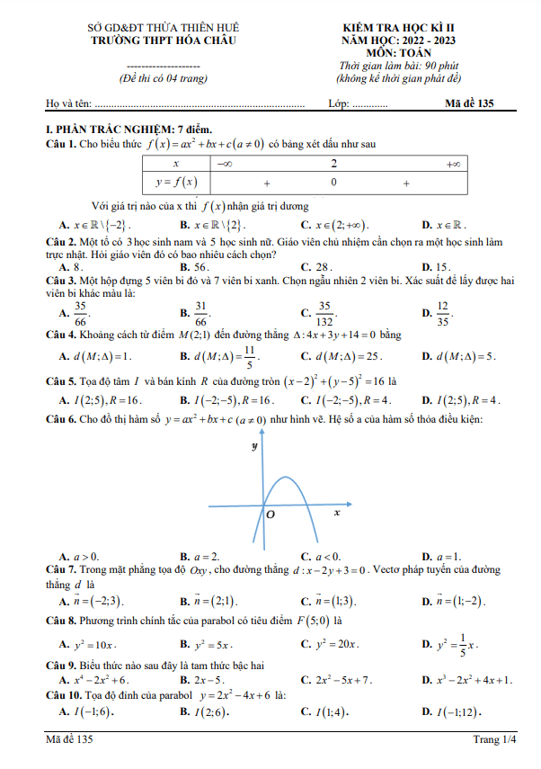 Đề học kì 2 Toán lớp 10 năm 2022 – 2023 trường THPT Hóa Châu TT Huế