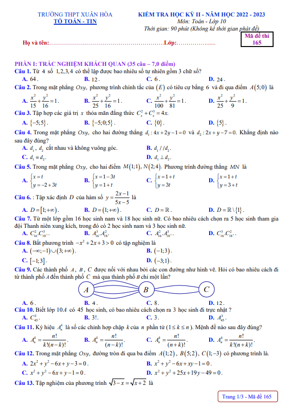 Đề học kỳ 2 Toán lớp 10 năm học 2022 – 2023 trường THPT Xuân Hòa Vĩnh Phúc