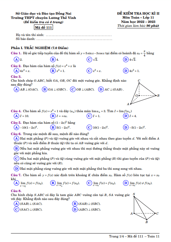 Chào các thầy cô và các em học sinh lớp 11! Đã đến lúc kiểm tra cuối học kì 2 môn Toán của chúng ta tại trường THPT chuyên Lương Thế Vinh, tỉnh Đồng Nai. Đề thi sẽ bao gồm 70% câu hỏi trắc nghiệm và 30% tự luận, với thời gian làm bài là 90 phút. Đề thi sẽ có đáp án và hướng dẫn chấm điểm mã đề 111 – 112 – 113 – 114.