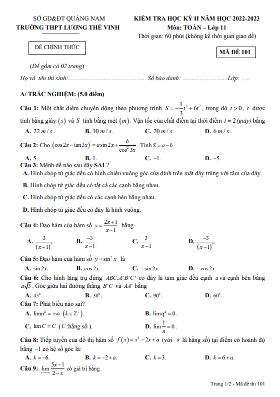 Chào mừng đến với đề kiểm tra cuối học kỳ 2 môn Toán lớp 11 năm học 2022-2023 trường THPT Lương Thế Vinh, tỉnh Quảng Nam. Đề thi sẽ bao gồm 50% câu hỏi trắc nghiệm và 50% câu hỏi tự luận, với thời gian làm bài là 60 phút (không tính thời gian giao đề). Đề thi sẽ có đáp án và lời giải chi tiết cho các mã đề sau: 101, 103, 105, 107, 102, 104, 106, 108.