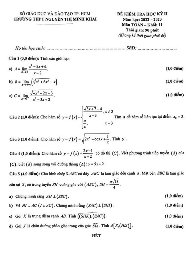 Trích đề học kỳ 2 Toán lớp 11 năm 2022 – 2023 trường THPT Nguyễn Thị Minh Khai: