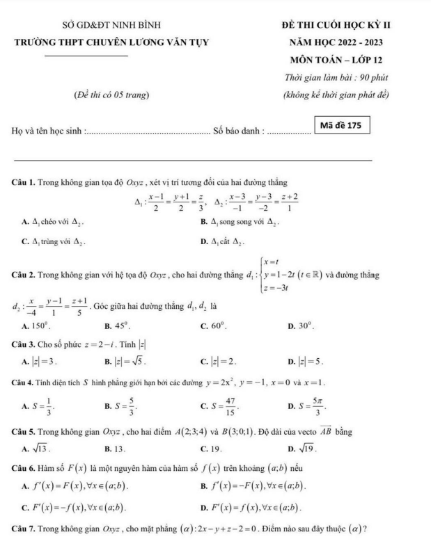 Chào các thầy cô giáo và các em học sinh lớp 12, hôm nay Sytu xin giới thiệu đến bạn đề kiểm tra chất lượng cuối học kỳ 2 môn Toán lớp 12 năm học 2022 – 2023 tại trường THPT chuyên Lương Văn Tụy, tỉnh Ninh Bình với mã đề 175. Đề thi được thiết kế với cấu trúc hoàn toàn là trắc nghiệm, gồm 50 câu hỏi và bài toán, thời gian làm bài 90 phút (không tính thời gian phát đề).