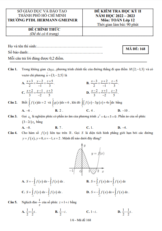 Chào quý thầy cô giáo và các em học sinh lớp 12! Đây là đề kiểm tra cuối học kỳ 2 môn Toán lớp 12 năm học 2022 – 2023 của trường PTDL Hermann Gmeiner, thành phố Hồ Chí Minh. Đề thi bao gồm câu hỏi trắc nghiệm và có đáp án mã đề 265 179 714 168.