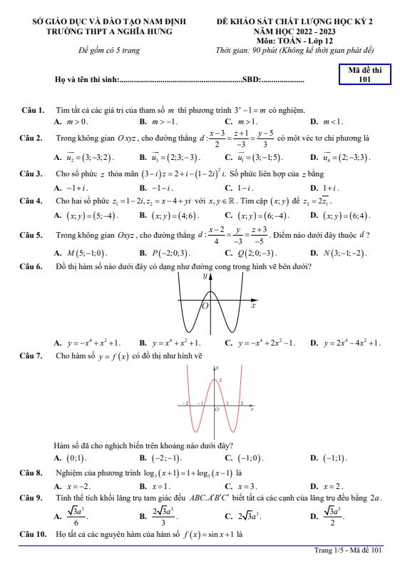 Chắc hẳn các bạn học sinh lớp 12 đều đang rất háo hức và lo lắng cho kỳ thi cuối học kỳ 2 môn Toán. Để giúp các bạn chuẩn bị tốt nhất cho kỳ thi sắp tới, Sytu xin giới thiệu đến các bạn đề khảo sát chất lượng cuối học kỳ 2 môn Toán lớp 12 năm học 2022 – 2023 trường THPT A Nghĩa Hưng, tỉnh Nam Định. Đề thi bao gồm các mã đề trắc nghiệm 101, 102, 103, 104 để các bạn có thể tự tin ôn tập và kiểm tra kiến thức của mình.