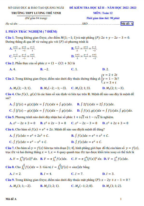 Chào quý thầy, cô giáo và các em học sinh! Hôm nay Sytu xin giới thiệu đến các bạn đề kiểm tra cuối học kì 2 môn Toán lớp 12 năm học 2022-2023 tại trường THPT Lương Thế Vinh, tỉnh Quảng Ngãi. Đề thi bao gồm 35 câu trắc nghiệm (tổng cộng 7 điểm) và 4 câu tự luận (tổng cộng 3 điểm), thời gian làm bài 90 phút.