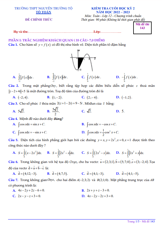 Sytu xin gửi đến quý thầy cô và các em học sinh lớp 12 đề kiểm tra cuối học kỳ 2 môn Toán năm học 2022 – 2023 tại trường THPT Nguyễn Trường Tộ, tỉnh Thừa Thiên Huế. Đề thi bao gồm 70% câu hỏi trắc nghiệm khách quan và 30% câu hỏi tự luận, thời gian làm bài là 90 phút (không tính thời gian phát đề). Đề thi có đáp án và hướng dẫn chấm điểm với các mã đề [143], [295], [387], [415].