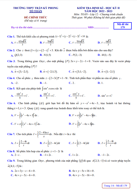 Đề học kỳ 2 Toán lớp 12 năm 2022 – 2023 trường THPT Trần Kỳ Phong – Quảng Ngãi